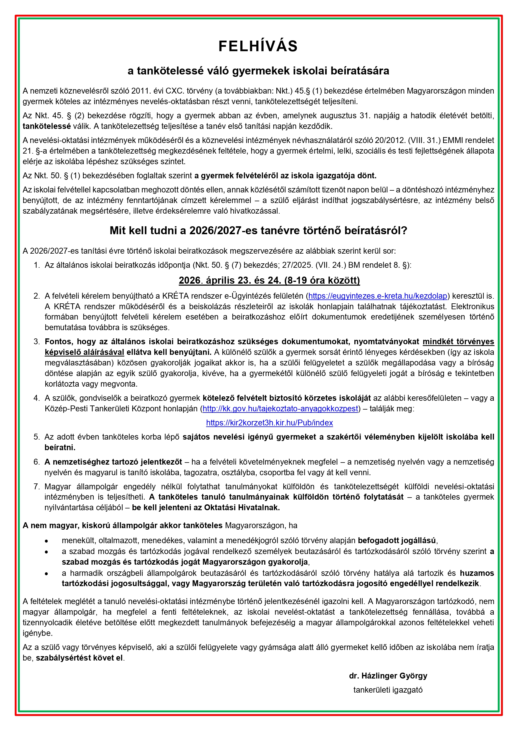 • 2026. április 23–24. – Beiratás