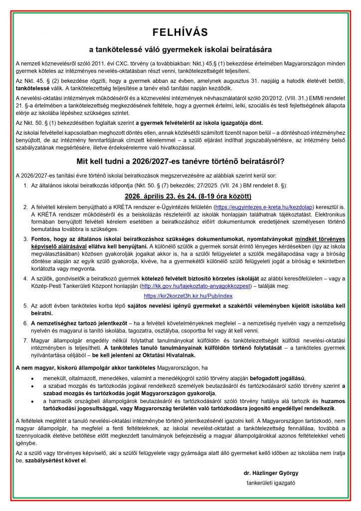 - 2026. június közepe – Osztályba sorolást követően: Szülői értekezlet a jövendő elsős szülők számára